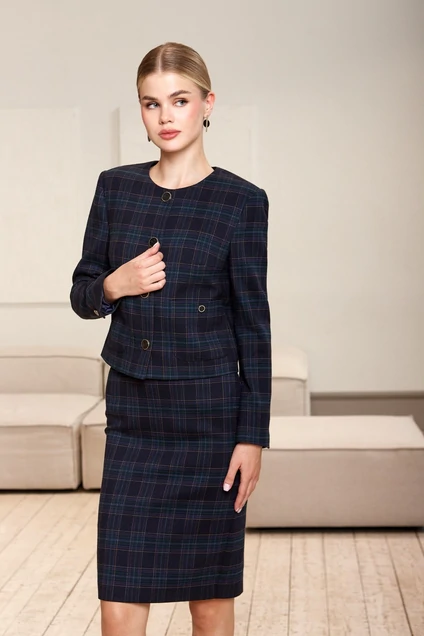 Жакет, прямого силуэта, длиной выше линии бёдер, с втачными двухшовными рукавами длиной до запястья, с круглой горловиной, без воротника. Застёжка центральная на петли и пуговицы. Детали переда с нагрудными вытачками из боковых швов, на уровне талии накладные карманы со скруглёнными концами, с застёжкой на петлю и пуговицу. Спинка со средним швом. Рукава со шлицей в локтевом шве, с застёжкой на петлю и пуговицу. Жакет на подкладке.