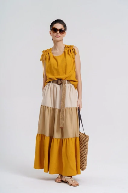 Комплект женский двухпредметный. Блуза без рукава с сборкой и завязками по плечу. Длина по спинке - см. Трехъярусная юбка миди с сборками и эластичным поясом. Длина с учетом пояса - см. Комплект дополнен съемным плетеным поясом.