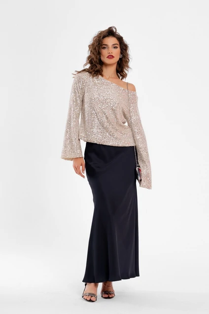 Комплект женский двухпредметный. Блуза из трикотажного полотна с пайетками свободного покроя на подкладке. Вырез горловины "лодочка", позволяет при желании спускать рукав с плеча. Рукав втачной длинный, слегка расширенный к низу. Длина по спинке - см, длина рукава - см. Юбка из атласной ткани на подкладке, А-силуэта, по талии на резинке. Длина по боковому шву - см.