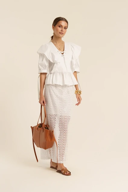Комплект женский двухпредметный. Блузка из хлопковой ткани свободного покроя с воланом по линии талии. Вырез горловины V-образный со шнуровкой из основной ткани. Рукава втачные объемной формы. Низа рукавов оформлены отрезными манжетами, переходящими в завязки. В вертикальные подрезы вставлены воланы с легкой сборкой. Длина блузы по спинке от линии горловины - 56 см., длина рукава от линии горловины - 46 см. Юбка- прямого силуэта их хлопковой ткани с вышивкой ришелье, на подкладке. Пояс изделия с эластичной тесьмой без застежки. В среднем шве спинки- высокий разрез. Длина юбки по боковому шву с поясом - 89 см.