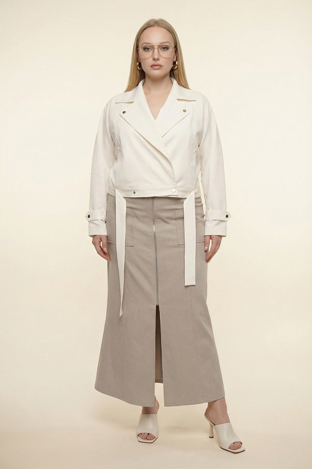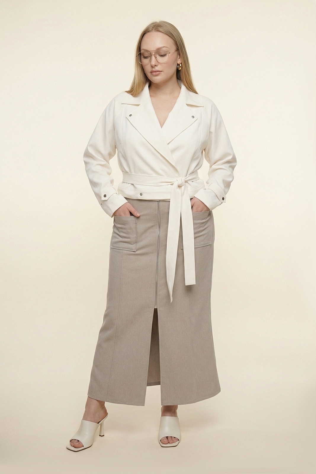 Костюм с юбкой 2447 Deesses воплощает в себе стиль и комфорт. Коллекция бренда Deesses предлагает двухпредметный комплект, выполненный из джинсовой ткани, состоящий из укороченного жакета и юбки. Жакет имеет свободный крой с воротником пиджачного типа и двубортной застёжкой на кнопки, дополненный стильными рукавами покроя реглан. Вертикальные рельефы переда украшают элегантные карманы. Основной материал — хлопок в сочетании с полиэстером и эластаном, обеспечивающий прочность и комфорт в повседневной носке. Костюм представлен в светлом цвете, что добавляет свежести в образ. Идеальный выбор для весенне-летнего сезона и офисного стиля, он подойдёт для рабочих встреч и городских прогулок.