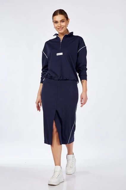 Костюм женский с юбкой. Кофта прямого силуэта с застежкой на тесьму-молнию по горловине переда. Линия плеча спущенная, рукав втачной одношовный с притачным манжетом по низу. Воротник-стойка. По низу кулиса с резинкой на фиксаторах. В качестве отделки используется отделочный кант и фурнитура. Юбка зауженная в низу, на переднем и заднем полотнище средний шов заканчивающийся шлицей. Верхний срез обработан поясом с резинкой. В качестве отделки используется отделочный кант и фурнитура. Длина кофты по спинке 56 см. , длина рукава 51 см. , длина юбки 80 см.