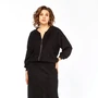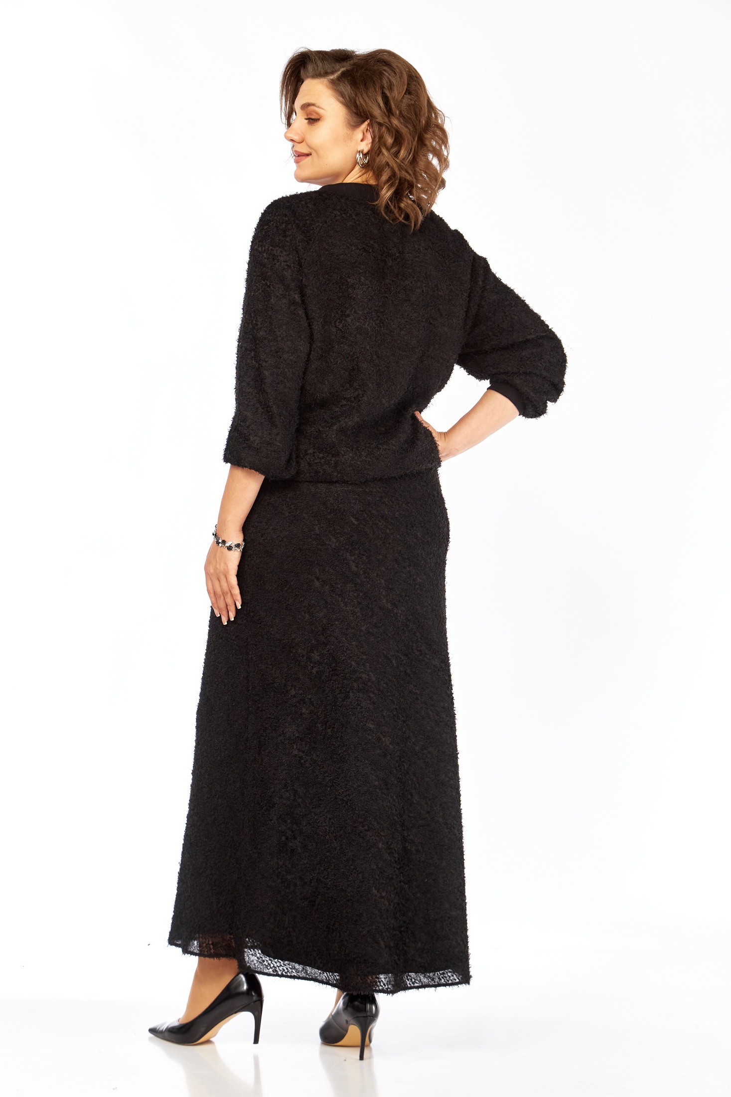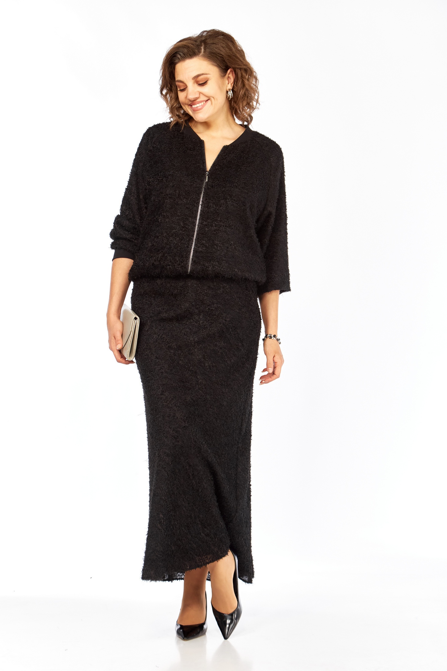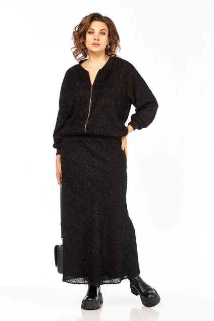 Костюм женский с юбкой. Кофта с центральной застежкой на тесьму-молнию, рукава-реглан. По низу изделия и низу рукава - манжет из отделочной ткани. По горловине воротник-стойка из отделочной ткани. Кофта на подкладке. Юбка длинная, верхний рсез обработан поясом с резинкой сзади. Застежка в левом боковом шве на тесьму молнию, петлю-пуговицу. Юбка на подкладке. Длина кофты по спинке 62 см, длина рукава+ширина плеча 70 см. Длина юбки 102 см.