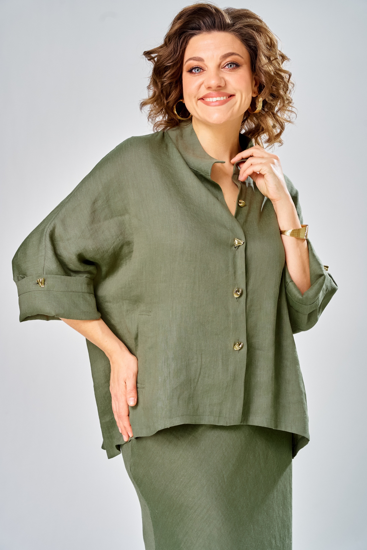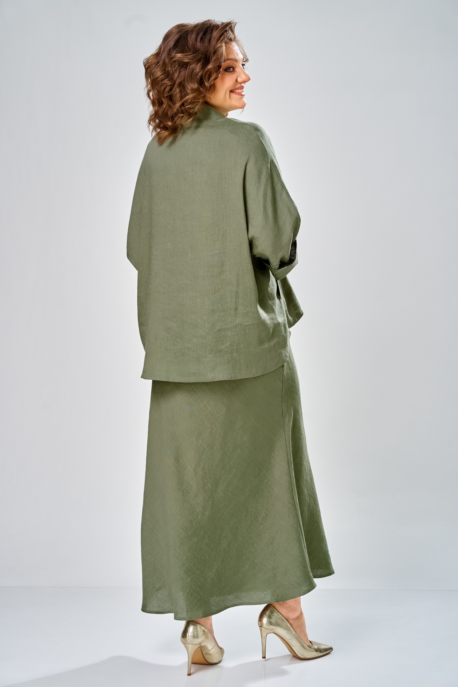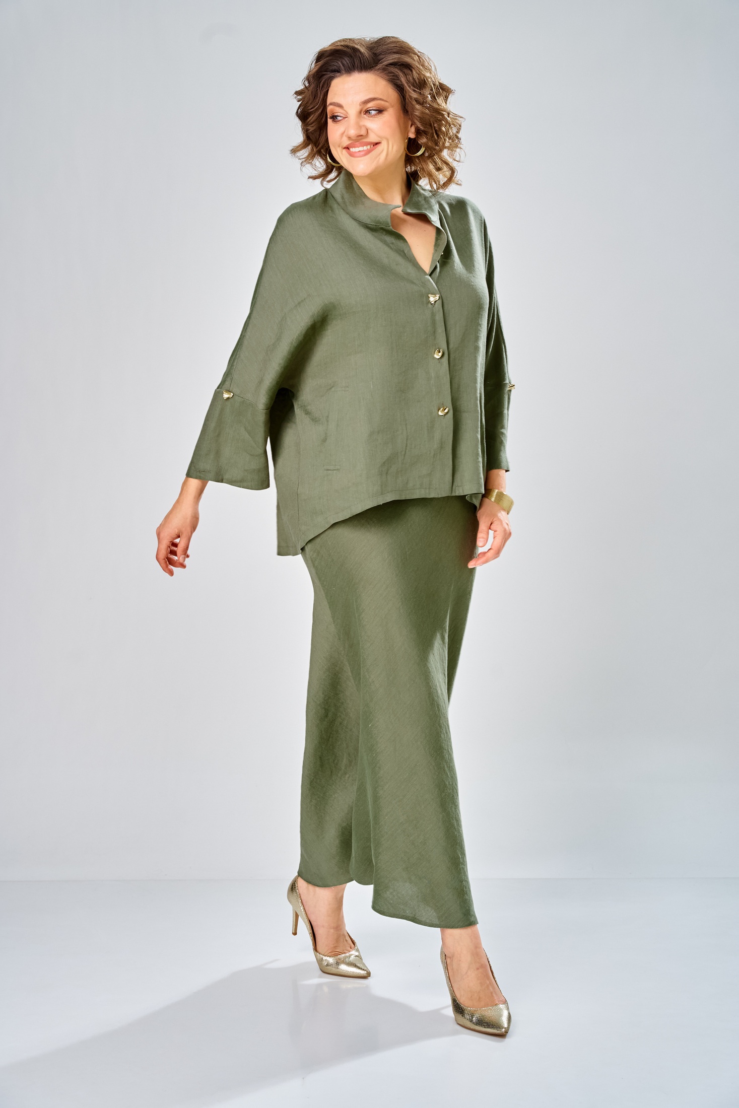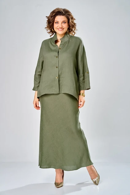 Костюм с юбкой 2152 олива Diamant — это идеальный выбор для стильных девушек. Коллекция бренда Diamant сочетает в себе легкость льна и мягкость вискозы, создавая комфортное сочетание для любого сезона. Комплект включает юбку и свободную рубашку, украшенную воротником-стойкой и прорезными карманами. Рубашка дополнена спущенным плечом и втачными рукавами, длиной 70 см по спинке. Юбка, длиной 108 см, сидит на талии благодаря резинке и потайной молнии. Оливковый цвет добавляет спокойствия и элегантности в повседневный или офисный стиль, делая его подходящим и для деловых встреч, и для прогулок. Ширина плеча+длина рукава 63 см
