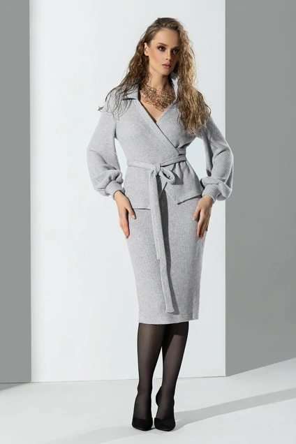 Комплект трикотажный состоящий из кофты и юбки. Кофта на запах с длинным рукавом, вырез горловины V-образный, воротник рубашечного типа. Юбка карандаш, пояс на резинке.