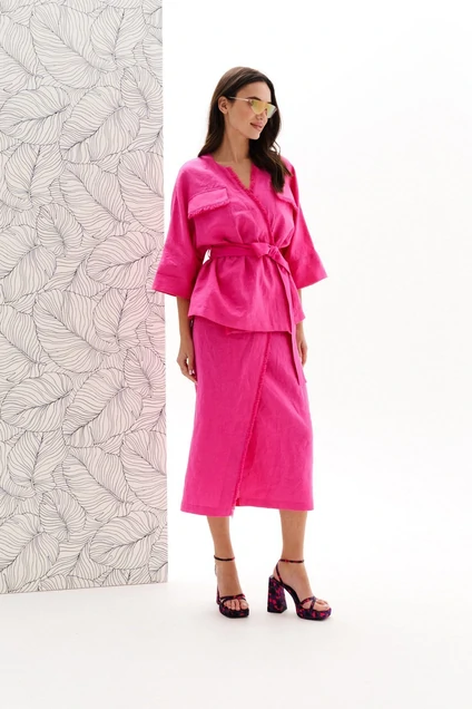 Комплект женский двухпредметный (жакет+юбка) из костюмно-плательной ткани. Жакет свободного силуэта, на запах, длиной до середины линии бедер. Со спущенной линией плеча, цельнокроеным рукавом и притачной манжетой. Перед с накладными карманами и клапанами. Край борта и клапана с отделочной бахромой из основной ткани. В боковых швах шлевки. Жакет с поясом из основной ткани. Юбка с ассиметричным запахом, длиной миди. Правая часть запаха с отделочной бахромой из основной ткани. В боковом шве юбки застежка на потайную молнию. Заднее полотнище с талиевыми вытачками. Юбка на притачном поясе, по спинке в поясе резинка для лучшего прилегания. Длина жакета 70 см, рукав 55 см. Длина юбки 85 см.