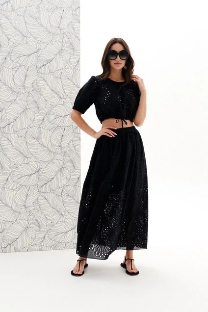 Комплект женский, двухпредметный (блузка+юбка) из хлопковой плательно-блузочной ткани с декоративной вышивкой. Блузка укороченная, длиной до талии. Спинка со средним швом и разрезом по горловине. Горловина круглая, застежка на навесную петлю, пуговицу на спинке. Рукав втачной, широкий, присборен по окату, низ рукава собран на резинку. Низ блузки собирается на кулису. Юбка длиной макси, на подкладке. Заднее полотнище со средним швом и застежкой на потайную молнию в нем. В боковых швах функциональные карманы. Юбка на притачном поясе на резинке. Длина блузки 41 см, рукав 32 см, длина юбки 101 см.