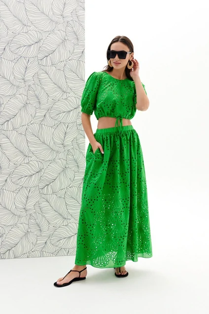 Комплект женский, двухпредметный (блузка+юбка) из хлопковой плательно-блузочной ткани с декоративной вышивкой. Блузка укороченная, длиной до талии. Спинка со средним швом и разрезом по горловине. Горловина круглая, застежка на навесную петлю, пуговицу на спинке. Рукав втачной, широкий, присборен по окату, низ рукава собран на резинку. Низ блузки собирается на кулису. Юбка длиной макси, на подкладке. Заднее полотнище со средним швом и застежкой на потайную молнию в нем. В боковых швах функциональные карманы. Юбка на притачном поясе на резинке. Длина блузки 41 см, рукав 32 см, длина юбки 101 см.
