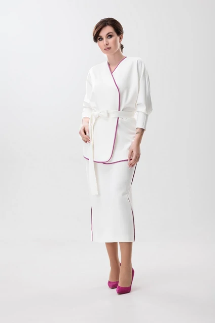 Костюм женский, из трикотажного полотна, состоящий из жакета и юбки. Жакет прямого силуэта, со спущенной линией плеча. Рукав втачной, одношёвный. Спинка со средним швом. Горловина V-образная. Застёжка на запах, на две пришивные кнопки. Жакет со съёмным поясом, из основной ткани, и шлёвками по бокам. Юбка прямого силуэта, с притачным поясом и резинкой. Задняя часть со средним швом, заканчивающимся разрезом. По горловине переда, краю борта и боковым швам юбки вставлен декоративный кант контрастного цвета из экокожи.