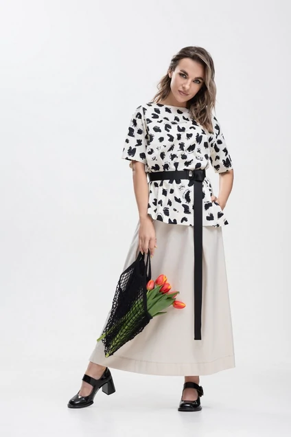 Комплект женский, состоящий из блузона и юбки. Блузон прямого силуэта, со спущенной линией плеча. Перед блузона и рукава выполнены из ткани с принтом, спинка - однотонная. Горловина круглая, расширенная. Рукав втачной, одношовный, короткий. Спинка со средним швом. Вырез горловины спинки с асимметричной застёжкой на петлю и пуговицу. Низ блузона асимметричный. В боковых швах разрезы. Юбка А-силуэта, с притачным поясом и резинкой по боковым частям. Перед и спинка с односторонними складками и декоративными патами. Задняя часть юбки со средним швом, застёжкой на потайную молнию, петлю и пуговицу и декоративным притачным клапаном. В боковых швах карманы и шлицы с декоративной петлёй и пуговицей. По низу юбки широкая подгибка. х/б 100%