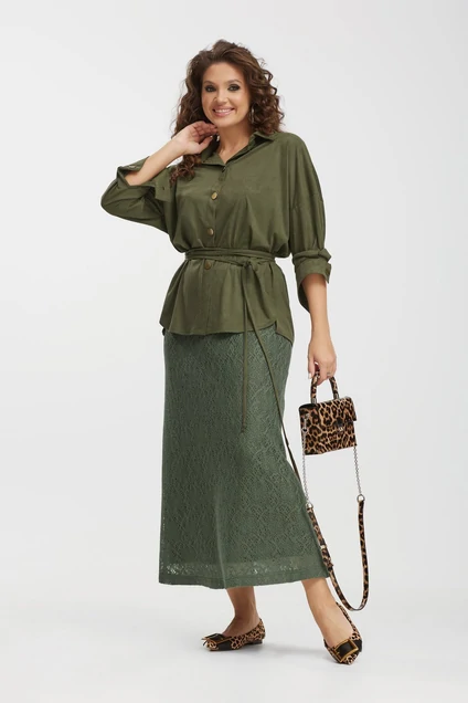 Комплект женский, состоящий из рубашки и юбки, выполненный из двухсторонней эко замши и кружевного трикотажного полотна. Рубашка прямого силуэта, со спущенной линией плеча. Застёжка на кнопки на планке. Воротник рубашечного типа. Спинка с кокеткой и складкой. Рукав втачной, оканчивающийся манжетой с застёжкой на петли и пуговицы. В боковых швах разрезы. Низ фигурный, разноуровневый. Юбка А-образного силуэта, на трикотажной подкладке. Пояс притачной с резинкой. Заднее полотнище юбки со средним швом. В комплекте пояс-шнурок из ткани рубашки.