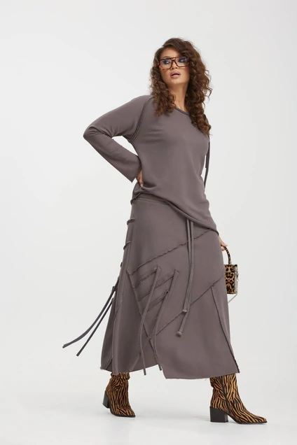 Костюм женский, состоящий из джемпера и юбки. Джемпер прямого силуэта. Вырез горловины - лодочка, с планками. Рукав длинный, покроя реглан, расширенный к низу. Низ джемпера асимметричный, разноуровневый. На левом плече декоративный элемент. Юбка А-образного силуэта. По переднему и заднему полотнищу асимметричные подрезы и декоративные элементы в виде шнура. Низ фигурный. Пояс притачной, с резинкой и шнурами. Некоторые швы комплекта с открытыми срезами.
