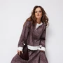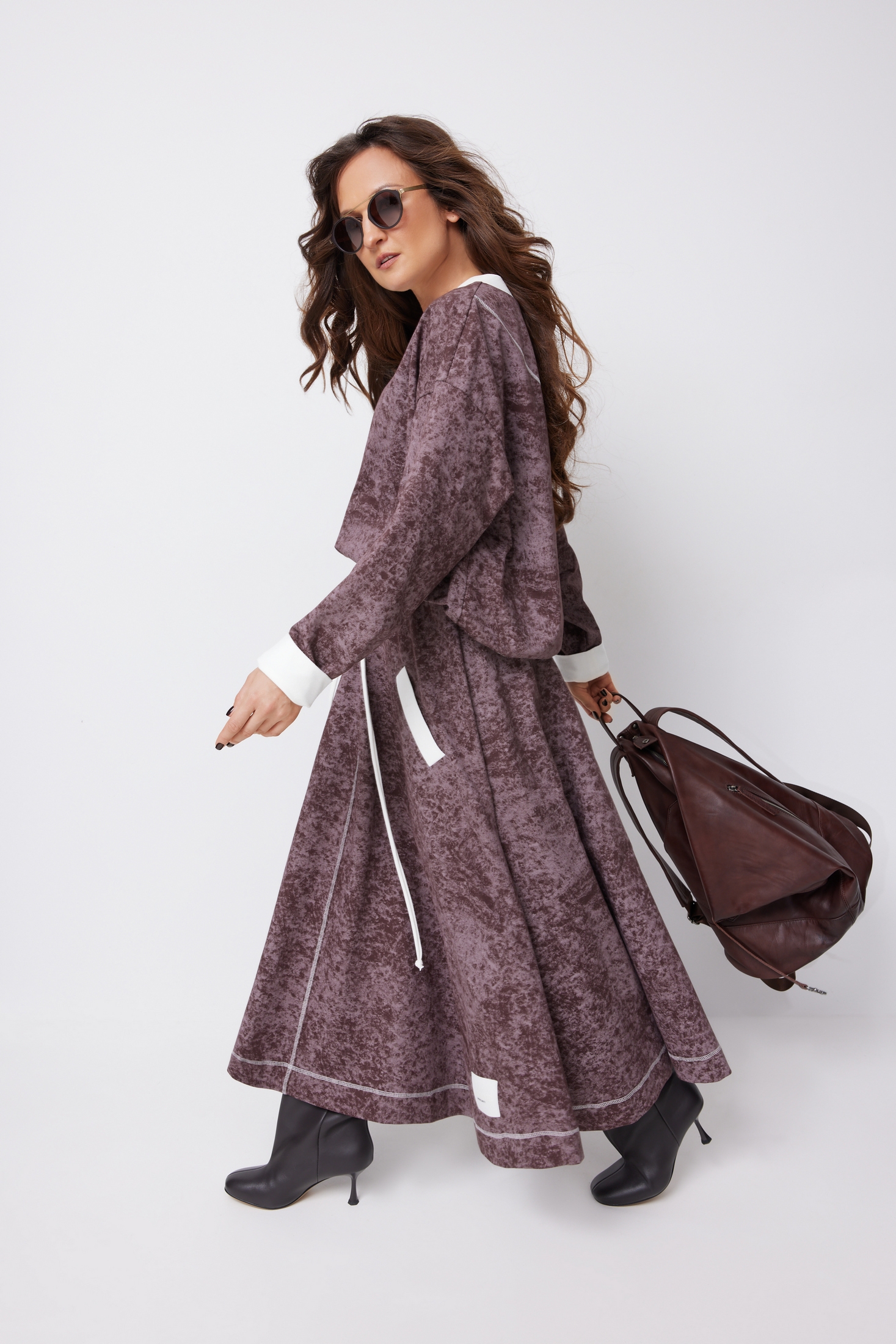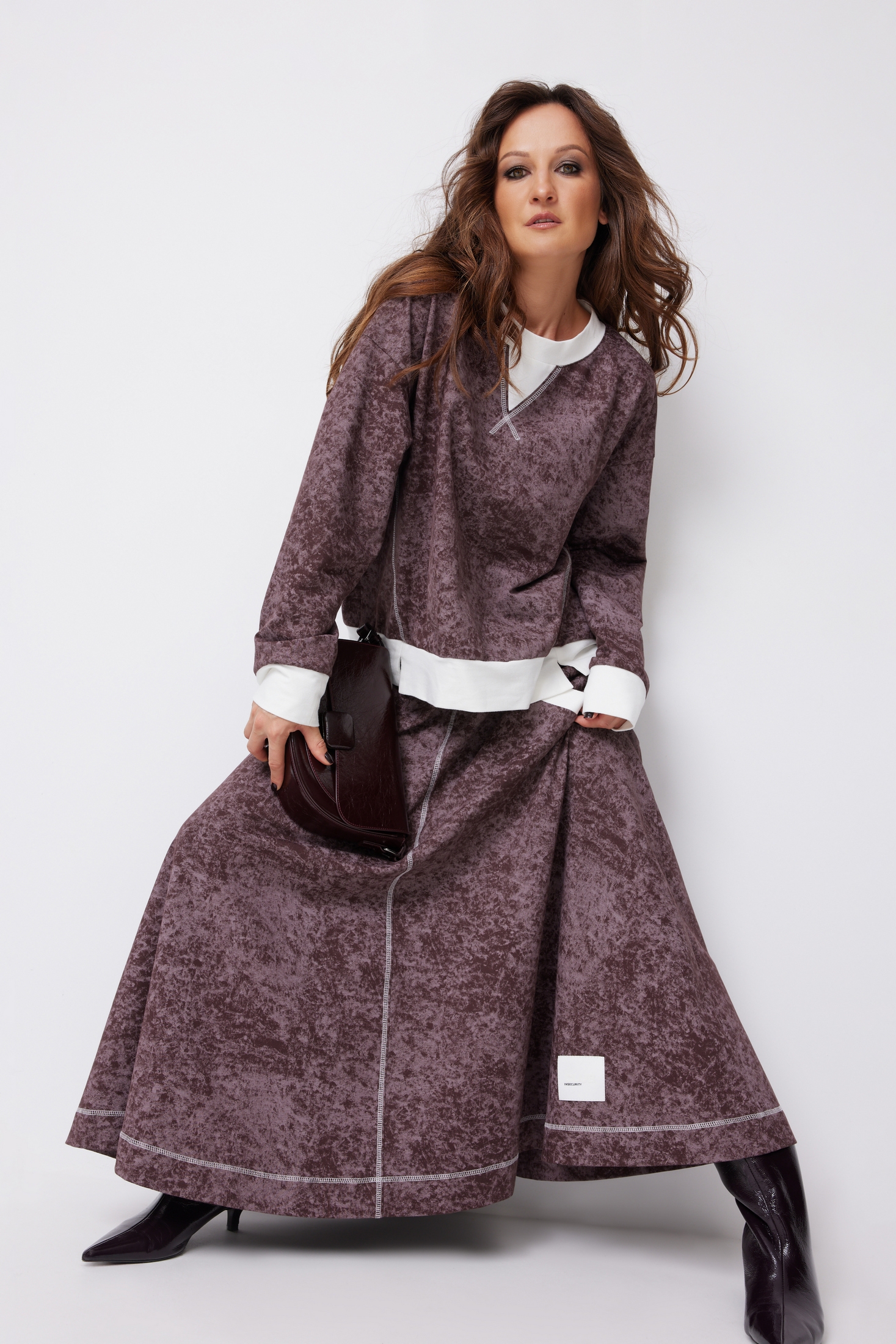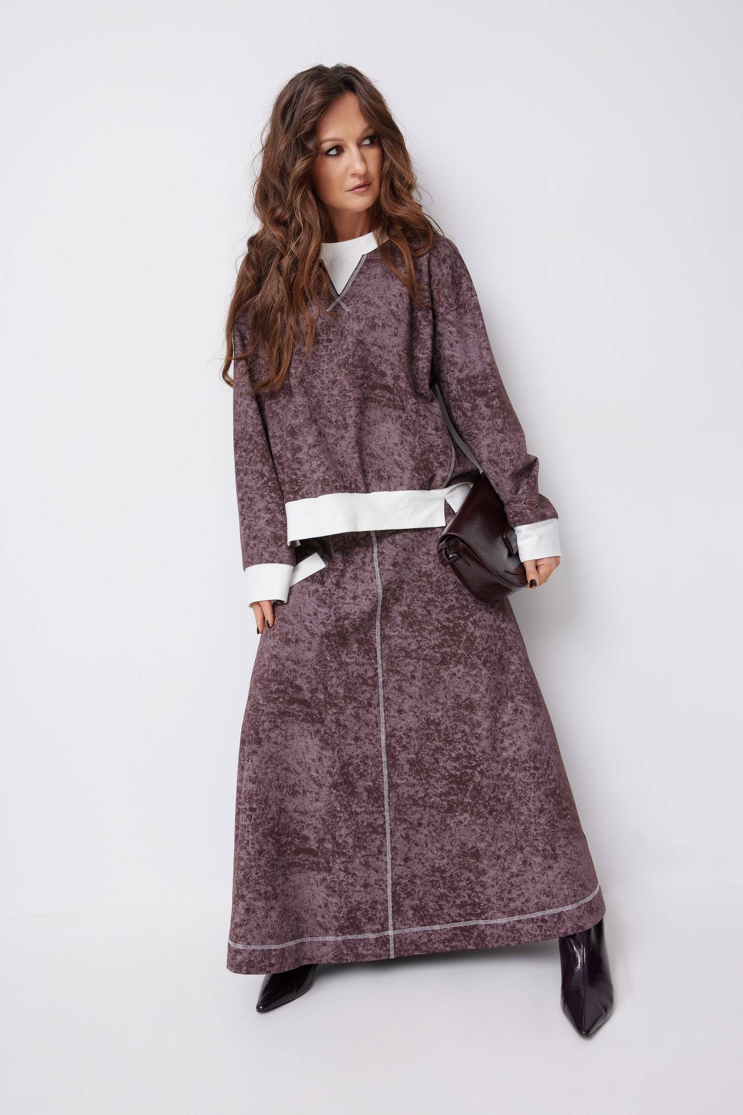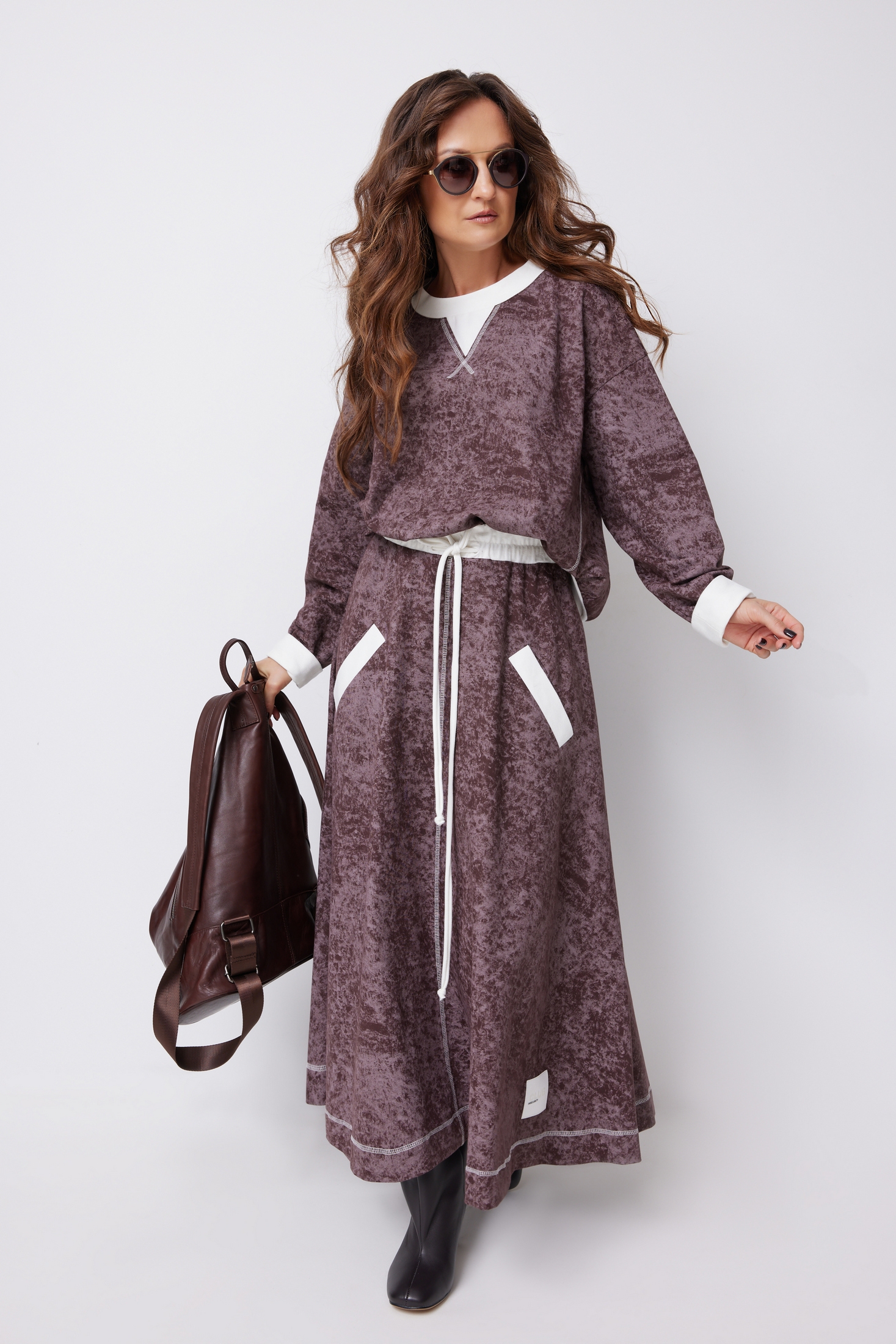 Костюм, состоящий из джемпера и юбки. Джемпер прямого силуэта, по переду рельефы и декоративная вставка контрастного цвета, по горловине притачная планка, линия плеча спущена, рукав втачной с манжетой. По низу притачная планка с разрезами по переду. Юбка-"колокол", переднее и заднее полотнища со средними швами, по переду прорезные карманы с листочкой, пояс притачной с резинкой по кругу и шнуром. В комплекте использованы декоративные контрастные строчки.
