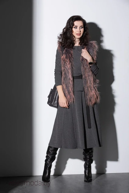 Модницы всех возрастов ценят меховые жилеты за удобство и красоту. Наш жилет не исключение: легкий и невесомый, что позволяет носить его под верхнюю одежду. В комплекте с меховым жилетом идет юбка и джемпер. Юбка расширенного к низу силуэта с клиньями в рельефах. Пояс притачной с резинкой. Джемпер прямого силуэта с отрезной планкой. Планка позволяет, при желании, открыть линию плеч. Подчеркнуть талию поможет пояс из ременной тесьмы, который идет в комплекте.
