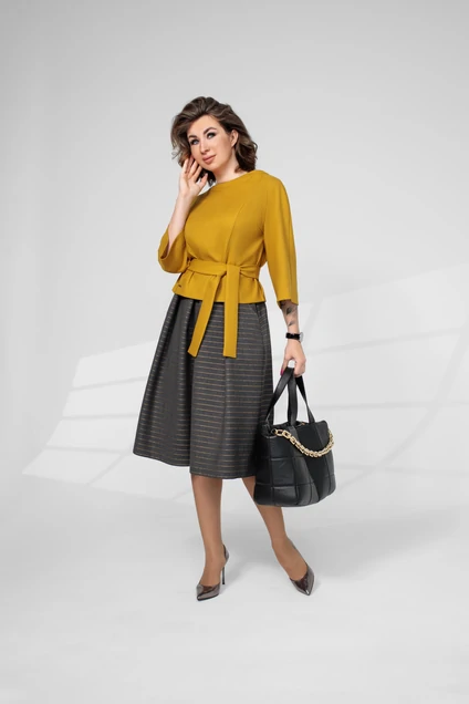 Комплект женский, состоящий из блузы и юбки. Блуза прямого силуэта. Рукав покроя реглан, длиной 3/4. Перед с подрезами и вытачками. Блуза с цельнокроеной стойкой на расширеной горловине. В боковых швах разрезы. Юбка прямого силуэта со складками от пояса. По переднему полотнищу карманы. Пояс притачной. Средний шов заднего полотнища с застежкой на потайную молнию, петлю и пуговицу. Юбка на подкладке. В комплекте пояс из основной ткани блузы. юбка: пэ 70%, вискоза 27%, эластан 3%