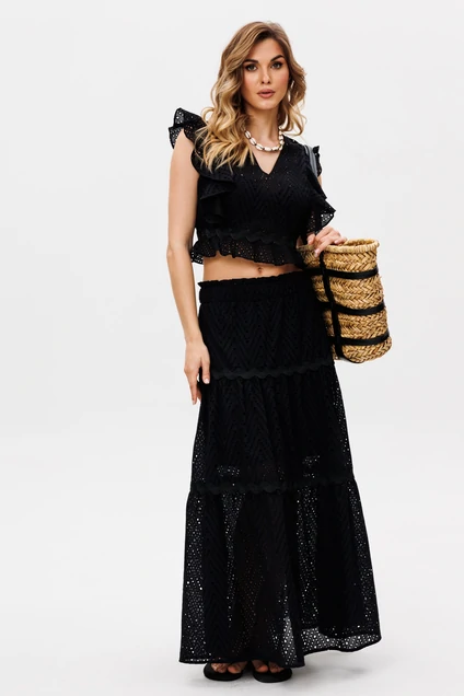 Комплект: блузка + юбка. Комплект выполнен из хлопка с вышивкой. Блузка облегающего силуэта, длиной до линии талии. Застежка на металлическую молнию в среднем шве спинки. Горловина V-образной формы. Плечевой шов заужен. Низ блузки обработан узким воланом. Юбка на притачном поясе, длиной миди, расширена к низу. Переднее и заднее полотнища состоят из трех ярусов, присборенных по линии притачивания друг к другу. Юбка на отлетной по низу подкладке до линии колена. Комплект декорирован отделочной тесьмой.
