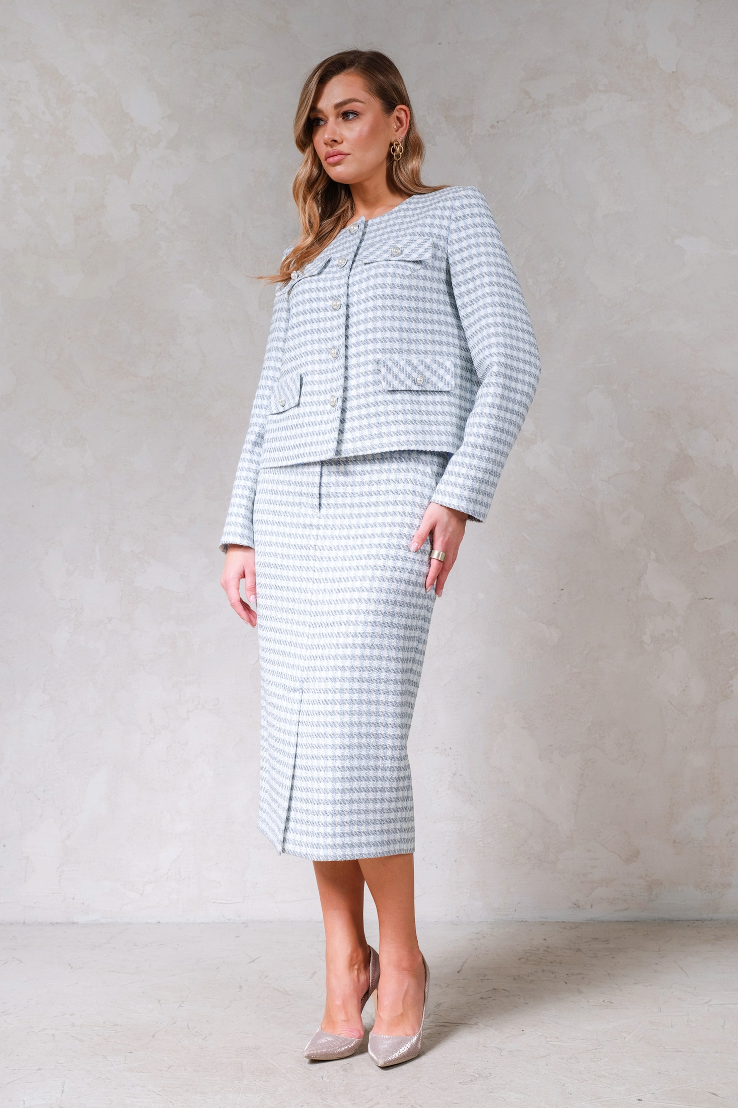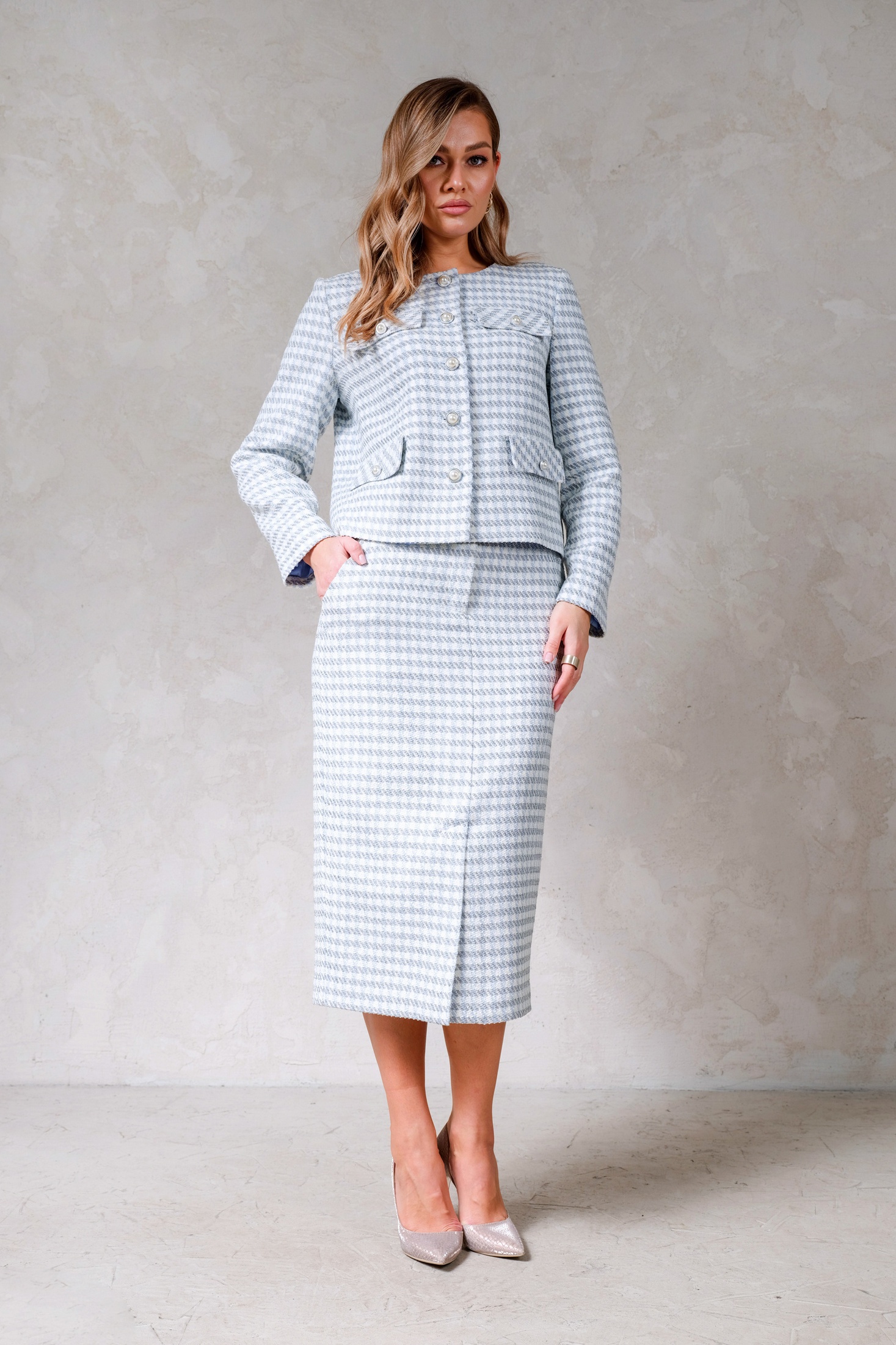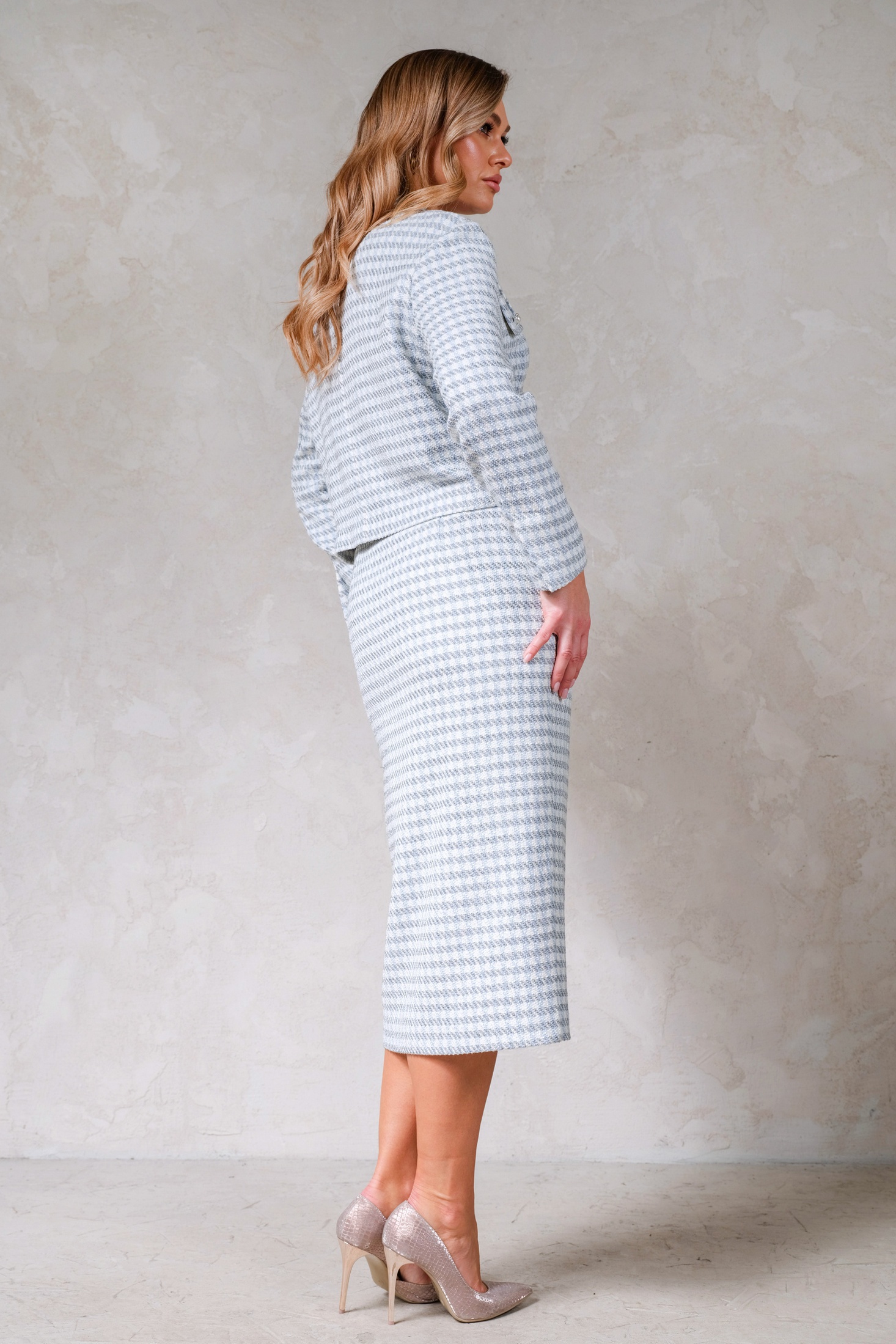 Костюм с юбкой 1753 голубой Erika — это элегантный и стильный женский комплект, идеально подходящий для офисного стиля. Коллекция бренда Erika предлагает костюм, состоящий из жакета полуприлегающего силуэта и юбки. Жакет выполнен с пиджачным воротником и лацканами, двумя рядами пуговиц и декоративными клапанами. Юбка имеет шлицу по переду и подкладку для комфорта и удобства. Материал из 65% хлопка и 35% района обеспечивает легкость и комфорт, идеально подходя для деловых встреч в весенне-летний сезон. Цвет голубой с добавлением узора подчёркивает индивидуальность и стиль.