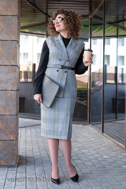 Жилет полуприлегающего силуэта, застежка спереди на пуговицы. Ремень входит в комплект. Длина жилета в 44-46-48 размерах 71 см, в 50-52-54 размерах 73 см. Длина юбки 71 см.