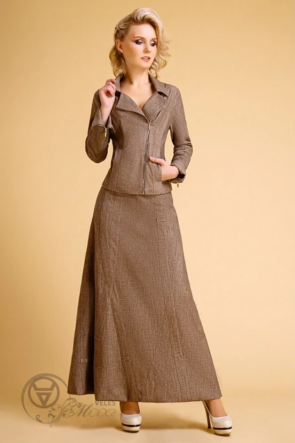 Костюм женский состоящий из юбки и жакета "косухи", костюм выполнен из ткани модного этой осенью цвета (внешне ткань напоминает лен). Жакет на полной подкладке, по полочке функциональные карманы, застежка декоративная разъемная молния.Высота жакета по спинке от плеча 55 см, полочка декорированна брошью, рукава втачные длина рукава-60 см. по низу рукава втачные молнии. Оригинальная юбка на поясе-кокетке, на полной подкладке, зактежка- потайная молния.Юбка декорирована настрочными элементами . Длина юбки по боковому шву 98 см.