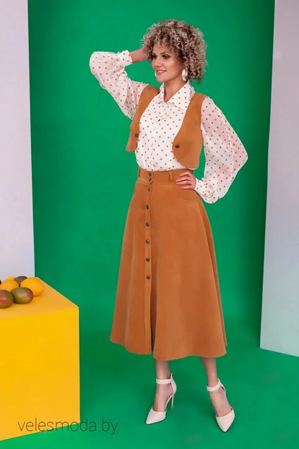Жилетка прилегающего силуэта, на полной подкладке, с застежкой- навесная петля и пуговица. Длина юбки – 83 см. Длина жилета по спинке – 35 см.