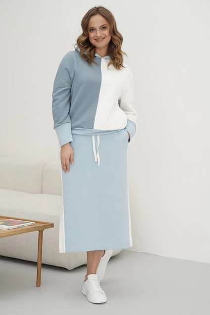 Перед тем, как отправиться на прогулку, шоппинг или активный вид отдыха, каждая из нас задумывается об одежде, которая будет практичной и одновременно стильной. Мы создали для вас спортивную капсулу, включающую несколько моделей худи, брюк и юбку, обьединенных общим стилистическим решением. Это позволяет составить комплект, который подходит именно вам, в котором вы точно почуствуете себя уверенно и комфортно. Худи колор-блок из хлопчатобумажного футера. Покрой - реглан, силуэт прямой свободный. Полочка с центральным швом и боковым карманом с листочкой. Капюшон со средним швом. По низу рукавов притачная манжета, по низу изделия - пояс.   Прямая удлиненная юбка выполненная также в стиле колор-блок. По боковым швам - разрезы. На переднем полотнище боковой карман с листочкой. Пояс - эластичный с отделочными люверсами и шнуром. Длина юбки около 80 см.