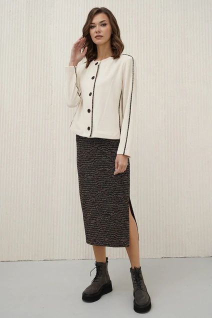 С приходом холодов всеобщая любовь и признание распространились на комплекты из нежных и комфортных трикотажных полотен. Безусловное лидерство захватили модели нейтральной цветовой гаммы: топленое молоко и карамель, оттенок слоновой кости и экрю. Ценительницы классической элегантности не устоят перед костюмом из эффектного жакета с кантами и контрастной юбки в стилизованную полоску. Жакет свободного силуэта, втачного покроя, с центральной застежкой на петли и пуговицы. Полочка с отрезным бочком и карманом в нем. Спина со средним швом. По линии плеча, центру рукава, рельефу и краю борта – отделочные канты. Юбка длины миди, прямая, с разрезом по боковому шву, отрезным поясом с эластичной тесьмой, застежкой в боковом шве.