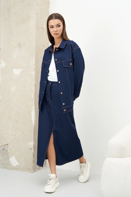 Джинсовые костюмы выигрывают соревнование по востребованности в повседневной жизни. Сегодня мы презентуем для вас самый актуальный вариант. Это новинка в джинсовой моде: юбка и джинсовая куртка. Джинсовая куртка-популярный повседневный образ, который можно встретить практически повсеместно. Силуэт-оверсайз, покрой рубашечный, воротник классический, застёжка центральная на джинсовые пуговицы. Полочка с отрезными кокетками, карманами с клапаном, вертикальными рельефами и карманом в боковом рельефе. Спинка с отрезной кокеткой и вертикальными рельефами. Рукав с локтевым швом, разрезом, и притачной манжетой.