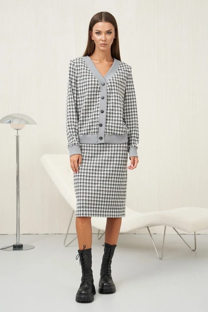 Модный трикотаж стал бесспорным "must have" в этом осеннем сезоне. Носить любимые и практичные трикотажные вещи теперь можно смело, не беспокоясь о модных тенденциях, а только соответствуя им. Практичность такого гардероба сложно переоценить, вещи из одного лука можно смело сочетать с другими вещами и при этом выглядеть супер современно. Комплект состоит из джемпера и юбки. Джемпер свободного силуэта с втачным рукавом. Застежка центральная на петли и пуговицы. По линии борта, низу изделия, рукавам и горловине - отделочная эластичная тесьма "довяз". Юбка зауженная к низу, на притачном поясе с частично эластичными вставками в области боковых швов. Длина джемпера около 52 см. Длина рукава около 60 см. Длина юбки около 55 см.