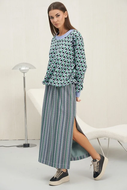 Без него не может обойтись ни один современный гардероб! Да! Это мы говорим о модном миссоне - трикотажном костюме - стильном, уютном, удобном, тёплом ансамбле, который уместен в любой ситуации. Если Вы находитесь в поиске идеального костюма из трикотажа, загляните на нашу страничку! Свитшот оверсайз-силуэта, с заниженной линией плеча, рубашечным рукавом, крупным вырезом горловины с отделочным довязом, отделочными манжетами рукава и регулирующимся низом с эластичной резинкой и фиксаторами. Длина изделия около 67 см. Длина рукава с плечом около 72 см. Юбка свободного силуэта, прямая с эффектным боковым разрезом по боковому шву. Переднее полотнище с наклонными боковыми карманами, заднее - со средним швом и застёжкой в нём. Пояс - эластичный в области спинки. Длина юбки около 85 см.