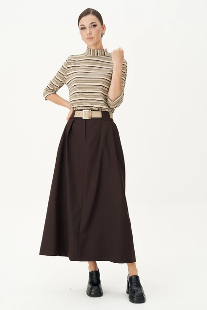 Один из главных пунктов в осеннем списке дел-покупка универсальной юбки. Коричневая юбка в длине макси с эффектными складками, переходящими в шлевки и акцентным поясом-сделает ваш образ в разы интереснее, чем просто юбка макси, а лаконичный лонгслив в мелкую полоску завершает образ.