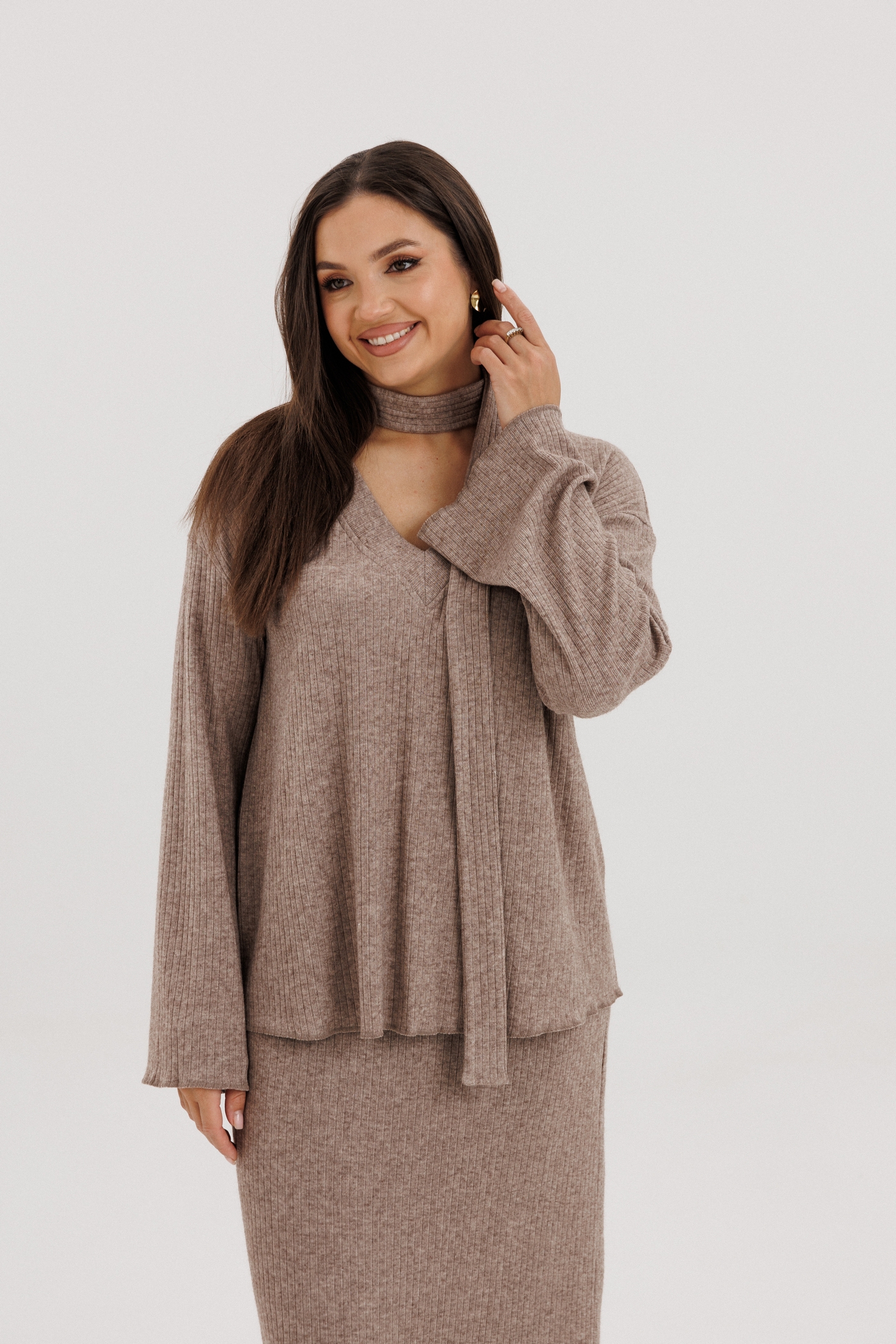 Свободный джемпер с заниженной линией плеча, рукавом, расширенным к низу, и V-образным вырезом.