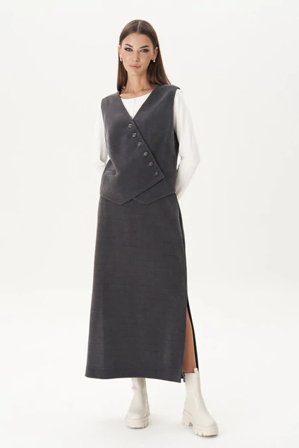 Костюм с жилетом - прекрасное решение для смелых экспериментов. Выполненный в ахроматической цветовой гамме, он позволяет дополнять себя различными аксессуарами и создавать каждый раз новые актуальные образы.