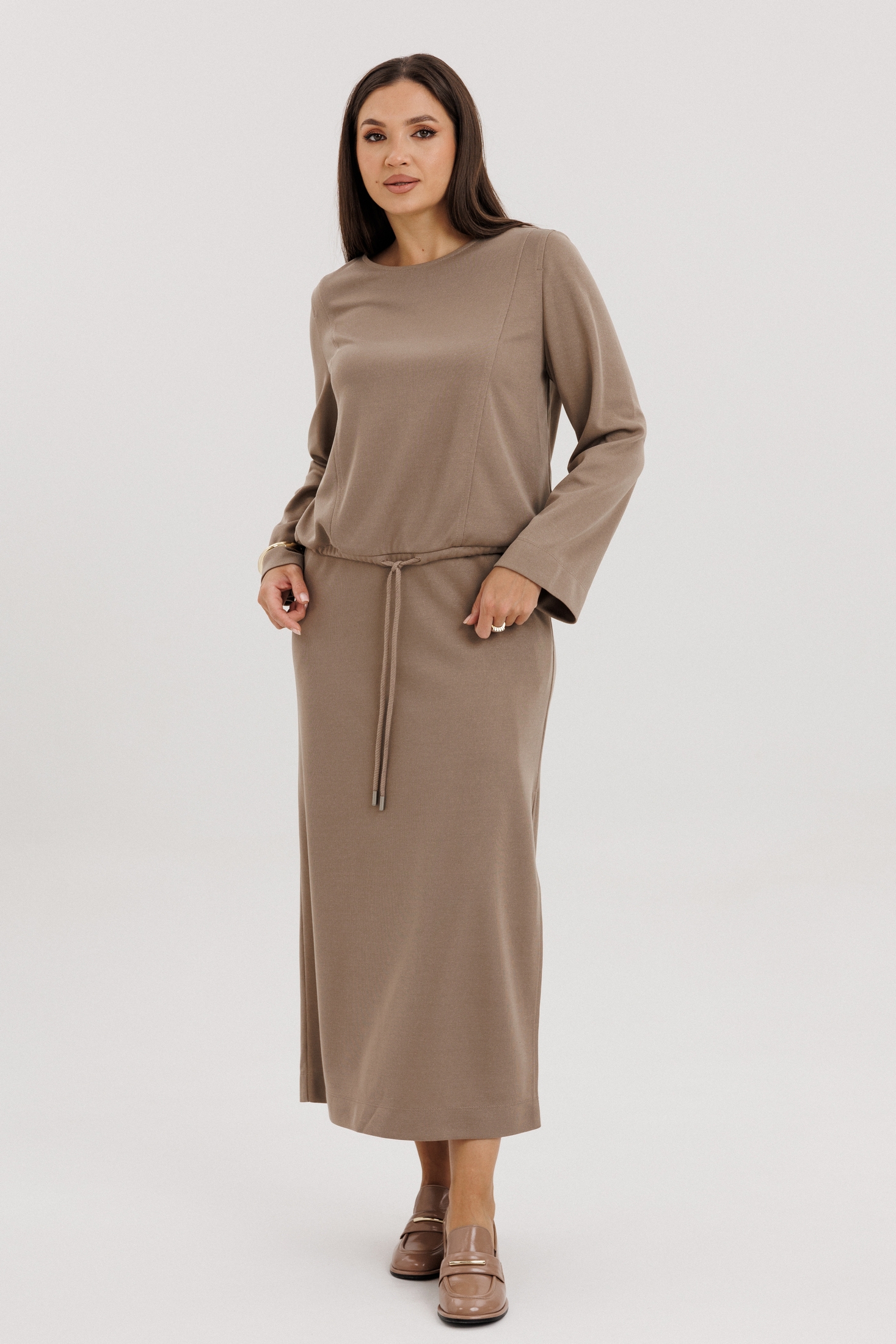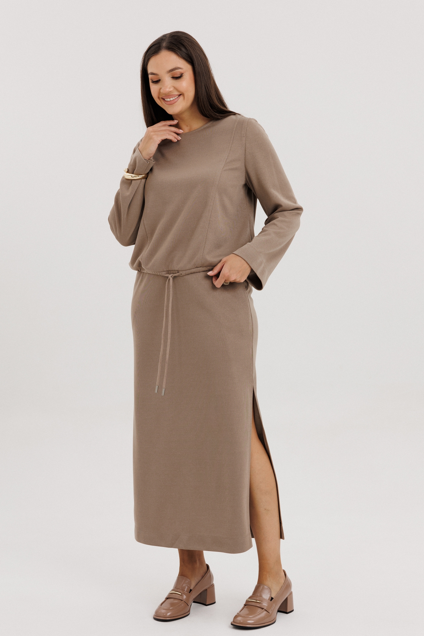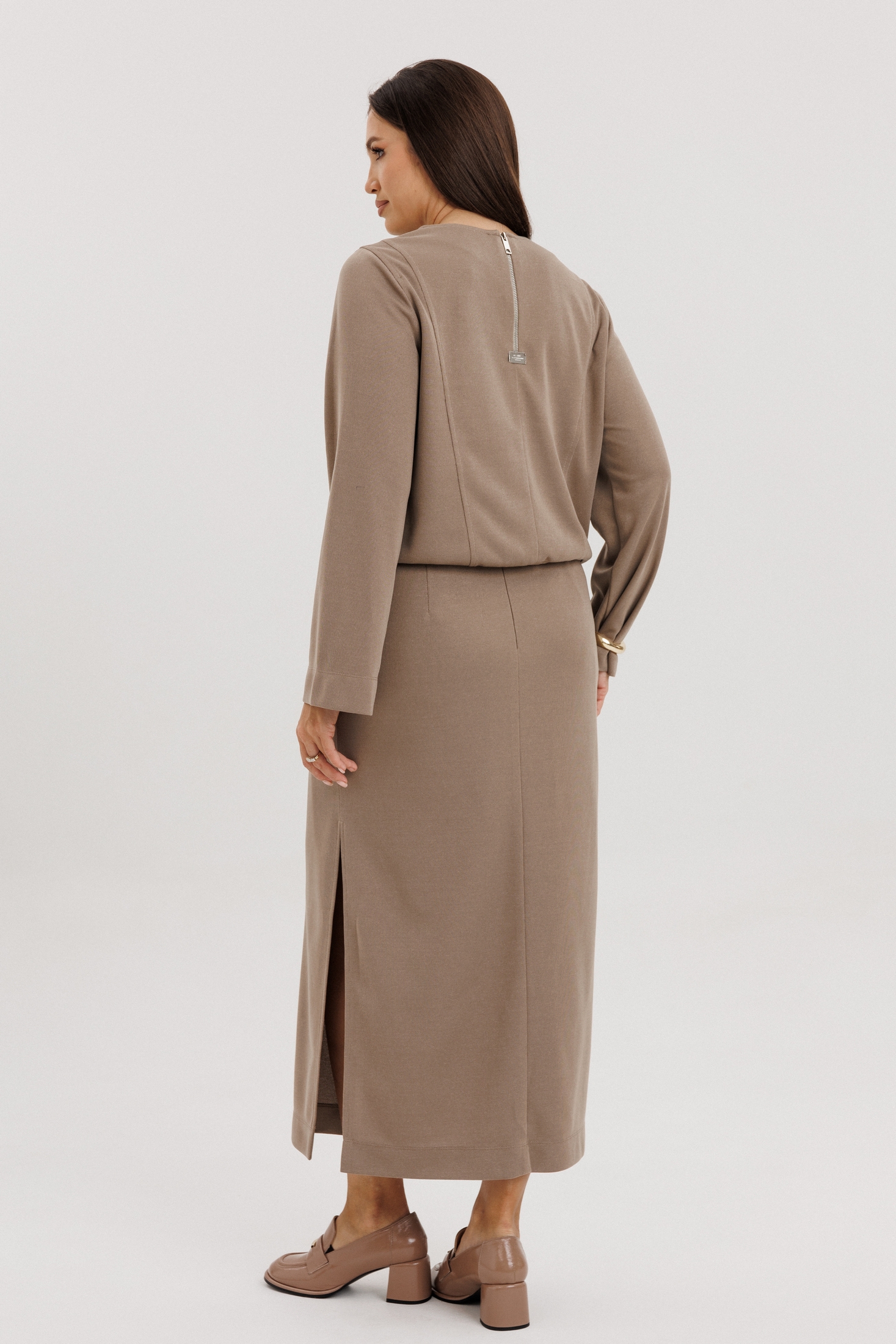 Свободный джемпер упрямлённого силуэта, втачного покроя с регулирующей кулисой по низу. Полочка с боковым вертикальным рельефом. Спинка с вертикальным рельефом, средним швом и застёжкой на отелочную молнию. Рукав с цельнокроеной манжетой. Юбка макси, на притачном эластичном поясе, с наклонными боковыми карманами и эффектным разрезом сбоку.