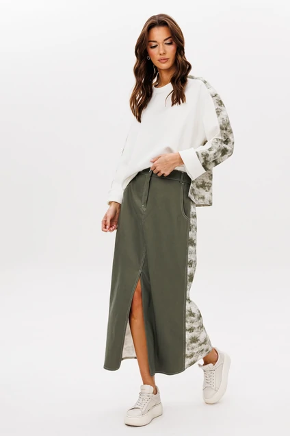 Юбка А-силуэта, на притачном поясе со шлевками, эластичном в области спинки, с перемещенным боковым швом в сторону полочки, наклонным боковым карманом, центральным швом с застежкой и разрезом. Переднее полотнище юбки-из однотонного полотна, заднее-из принтованного. На задних половинках юбки-отрезные кокетки и накладные карманы из отделочного полотна.