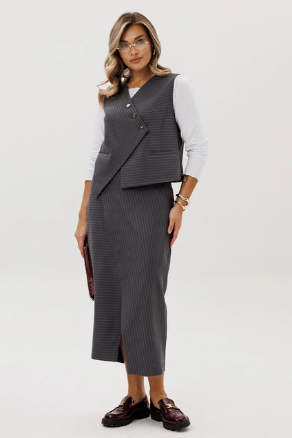 Стильный женский костюм в полоску — идеальное сочетание элегантности и современного минимализма. Комплект состоит из жилета оригинального кроя с асимметричной застёжкой, прямой юбки миди с мягким запахом и джемпера с длинным рукавом. Модель выполнена из плотной трикотажной ткани с тонкой вертикальной полоской, которая визуально вытягивает силуэт и подчёркивает стройность. Жилет без рукавов застёгивается на декоративные пуговицы, создавая выразительный акцент в образе. Юбка миди с запахом добавляет женственности и комфорта при движении. Джемпер трикотажный, с длинным рукавом, полуприлегающего силуэта.