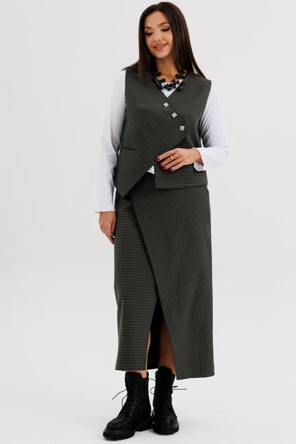 Стильный женский костюм в полоску — идеальное сочетание элегантности и современного минимализма. Комплект состоит из жилета оригинального кроя с асимметричной застёжкой, прямой юбки миди с мягким запахом и джемпера с длинным рукавом. Модель выполнена из плотной трикотажной ткани с тонкой вертикальной полоской, которая визуально вытягивает силуэт и подчёркивает стройность. Жилет без рукавов застёгивается на декоративные пуговицы, создавая выразительный акцент в образе. Юбка миди с запахом добавляет женственности и комфорта при движении. Джемпер трикотажный, с длинным рукавом, полуприлегающего силуэта.