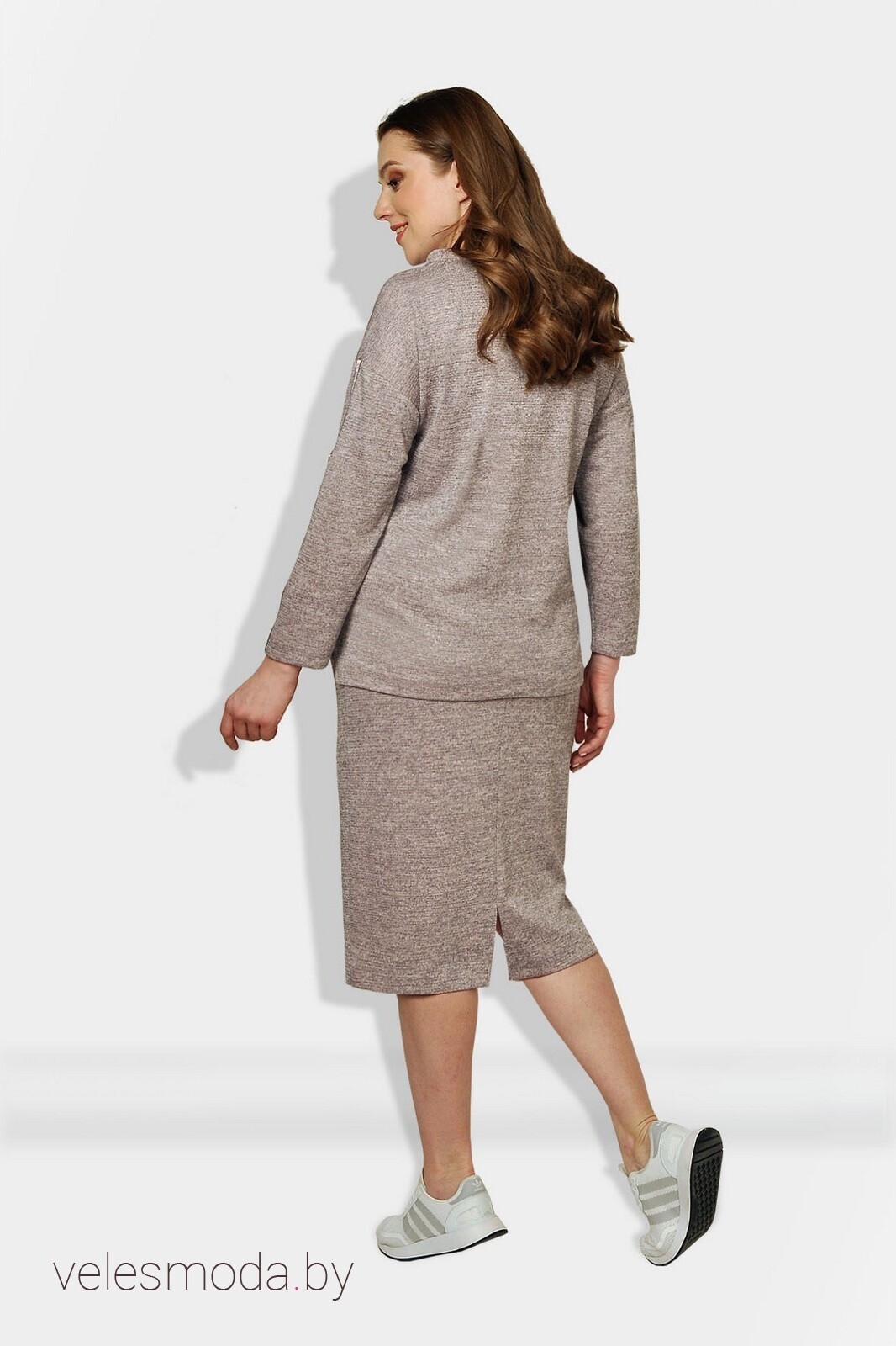 Костюм женский, юбочный. Выполнен из трикотажного полотна с чуть заметной люрексовой нитью. Спинка джемпера и перёд – цельнокраёные, со спущенным плечом. Рукав – одношёвный, с настроченной отделочной тесьмой и полукольцом. Горловина круглая с объёмной планкой. Юбка на трикотажной подкладке и поясе с резинкой, по правому боковому шву настрочена отделочная тесьма. Сзади юбка имеет средний шов с небольшим разрезом. Длина джемпера по центру спинки - 65 см, по переду – 62 см. Длина рукава – 51 см. Длина юбки с поясом – 71 см.