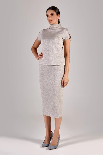 Костюм из мягкого трикотажного полотна с люрексовой нитью, которая придает небольшой блеск. Комплект состоит из джемпера и юбки полуприлегающего силуэта. Джемпер с цельнокроеным воротником- стойкой, на рукавах декоративная капелька. Юбка прямого силуэта, зауженная к низу, шлица по среднему шву, пояс на резинке.