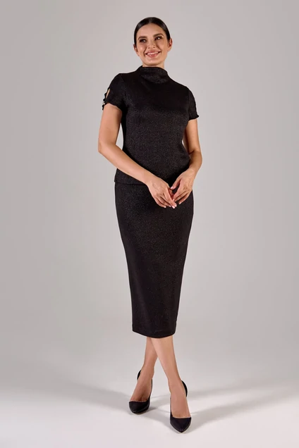 Костюм из мягкого трикотажного полотна с люрексовой нитью, которая придает небольшой блеск. Комплект состоит из джемпера и юбки полуприлегающего силуэта. Джемпер с цельнокроеным воротником- стойкой, на рукавах декоративная капелька. Юбка прямого силуэта, зауженная к низу, шлица по среднему шву, пояс на резинке.
