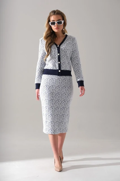 Костюм женский изготовлен из трикотажной ткани.Низ жакета, рукава и край борта обработан довязом. Жакет имеет v-образный вырез. Застёгивается на четыре петли пуговицы.