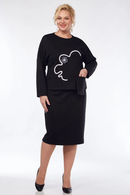 Костюм женский полуприлегающего силуэта из трикотажного полотна, состоящий из джемпера покроя «летучая мышь» и юбки, зауженной ниже колена.