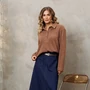 Костюм сотоит из джемпера и юбки. Джемпер прямого силуэта с воротником поло из теплого трикотажного полотна. Рукав втачной одношовный. Юбка А-образного силуэта из плотного джинса. Передняя часть юбки со средним швом. С правой стороны вверху настрочен карман с клапаном- шлевкой. Задняя часть юбки со средним швом и вытачками. Сверху в среднем шве обработана потайная молния. Вдоль линии пояса настрочены шлевки. Пояс цельнокроеный на обтачке. Юбка на подкладке. Вдоль среднего шва по переду и по периметру кармана проложена декоративная строчка. К юбке прилагается сьемный ремень. Фурнитура может быть изменена с охранением художественного замысла. Длина юбки - 78 см, длина джемпера- 66 см, длина рукава - 60 см