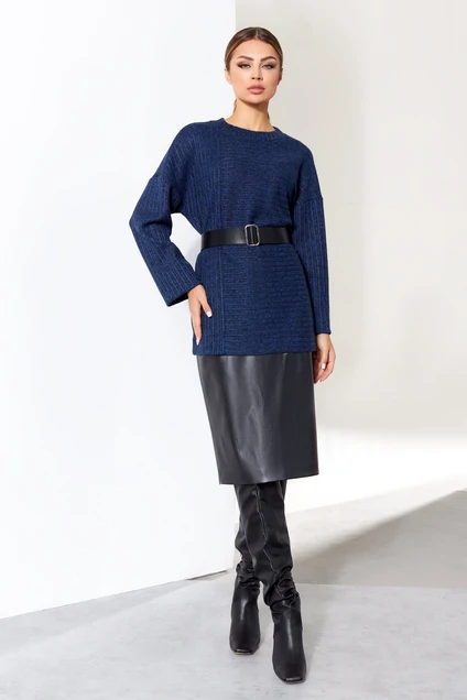 Удлиненный джемпер свободного силуэта со спущенным плечом. Полочка состоит из двух деталей, боковая деталь покроена по нити основы центральная по утку. По горловине воротник стоечка. Юбка силуэта карандаш на подкладке из эко кожи. Переднее полотнище юбки с двумя вытачками по талии, заднее со средним швом, в верху молния и две вытачки по талии. Длина джемпера- 70 см, рукава-48 см, длина юбки-65 см. Фурнитура может быть изменена.
