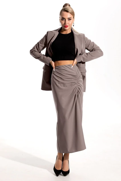Жакет с центральной застежкой на петли и пуговицы, отложным воротником и лацканами пиджачного типа По переду рельефы, выходящие из проймы, прорезные карманы с клапанами и двумя обтачками. Спинка со средним швом, рельефами, выходящими из проймы. Рукав втачной, длинный. Юбка прямая, без пояса, верхний срез обработан обтачками. Переднее полотнище с асимметричным рельефным швом, заканчивающимся разрезом. Рельефный шов присборен. Заднее полотнище юбки со средним швом, талиевыми вытачками.