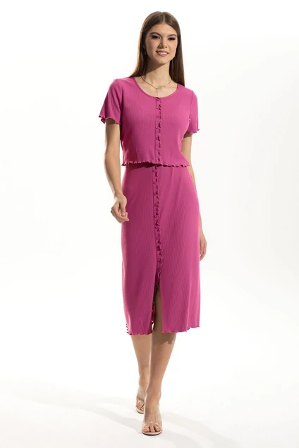 Юбка прямая, без пояса, верхний срез на резинке. Переднее полотнище со средним швом, заканчивающимся разрезом и рюшей, выходящей из среднего шва.