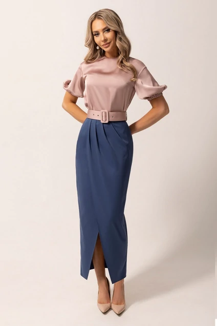 Блузка без воротника, с круглым вырезом горловины, застежкой на навесную петлю и пуговицу по среднему шву спинки. Перед с нагрудными вытачками. Спинка со средним швом. Рукав втачной, ¾, с отрезной манжетой. Манжета присборена на резинку. Блузка со съемным поясом. Юбка прямого силуэта, с отрезным поясом. Переднее полотнище со складками по верхнему срезу, полотнища с запахом, заднее полотнище со средним швом, талиевыми вытачками.