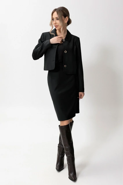 Комплектация: жакет, юбка на подкладке. жакет с центральной застежкой на петли и пуговицы, с отложным воротником. На полочках расположены прорезные карманы с листочками. Спинка с талиевыми вытачками. Рукав втачной, длинный. Юбка без пояса. Верхний срез обработан обтачками. Застежка на потайную молнию в среднем шве спинки. Заднее полотнище со средним швом, заканчивающимся шлицей.