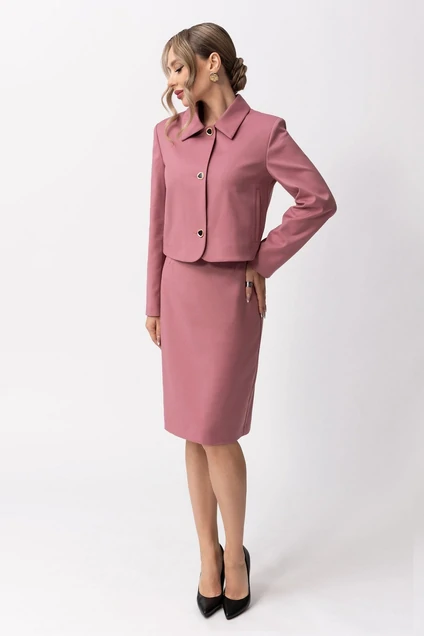 Комплектация: жакет, юбка на подкладке. жакет с центральной застежкой на петли и пуговицы, с отложным воротником. На полочках расположены прорезные карманы с листочками. Спинка с талиевыми вытачками. Рукав втачной, длинный. Юбка без пояса. Верхний срез обработан обтачками. Застежка на потайную молнию в среднем шве спинки. Заднее полотнище со средним швом, заканчивающимся шлицей.