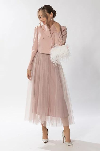 Жакет с центральной двубортной застежкой на петли и пуговицы, с отложным воротником- шаль. По переду с рельефами, выходящими из проймы. Спинка со средним швом, рельефами, выходящими из проймы. Рукав втачной, длинный, с бантовой складкой по окату. Юбка с отрезным поясом, застегивающимся на одну петлю и пуговицу. В области спинки пояс присборен на резинку. Юбка на подкладке. Верх юбки- двойной слой фатина со сборкой по шву притачивания к поясу.
