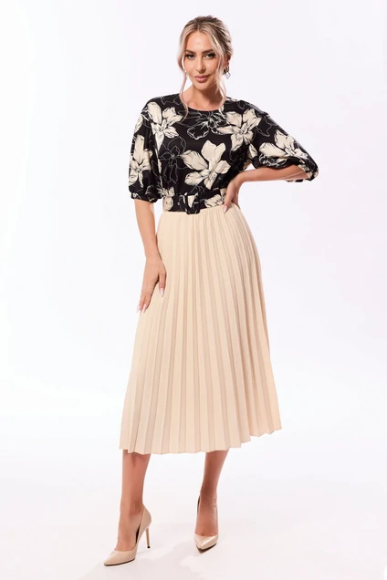 Комплектация: блузка, юбка. Блузка, без воротника, с круглым вырезом горловины, застежкой на потайную молнию в среднем шве спинки. По переду с нагрудными вытачками. По спинке со средним швом. Рукава с отрезной манжетой, присборенной на резинку. Плечо спущенное. Юбка, с отрезным поясом, застежкой на потайную молнию в левом боковом шве. Юбка плиссированная со складками гофре. Комплект со съемным поясом.